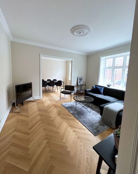 I denne lejlighed i Esbjerg har vi i dansk plank været med under en totalrenovering, hvor vi har lagt det smukke sildebensgulv i eg.