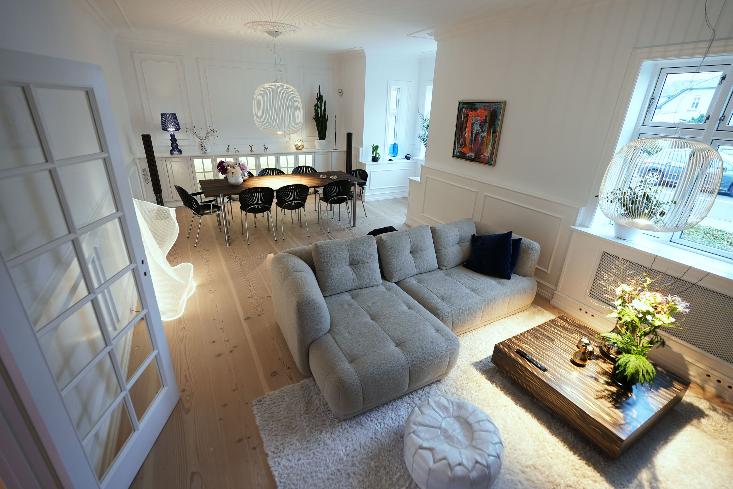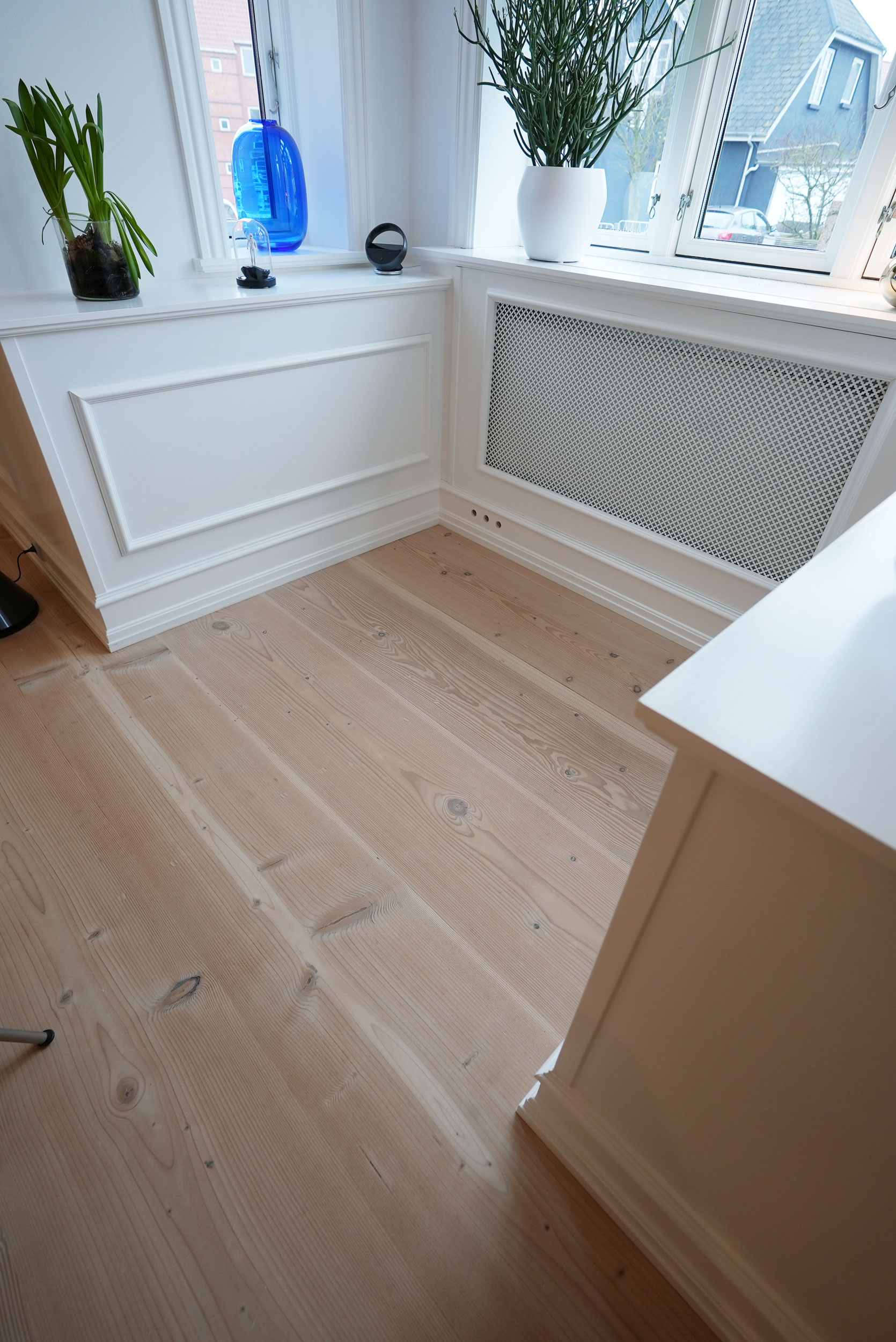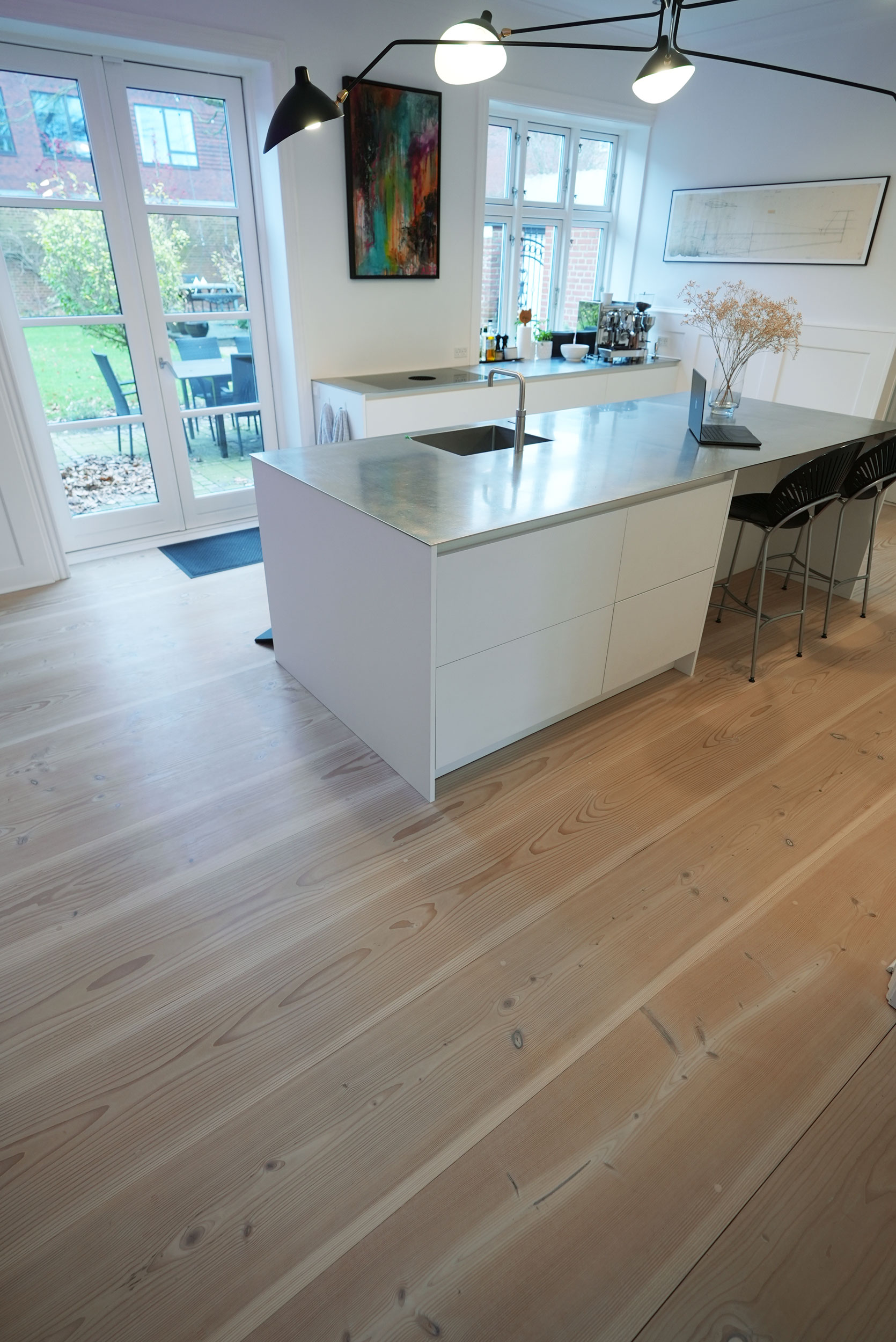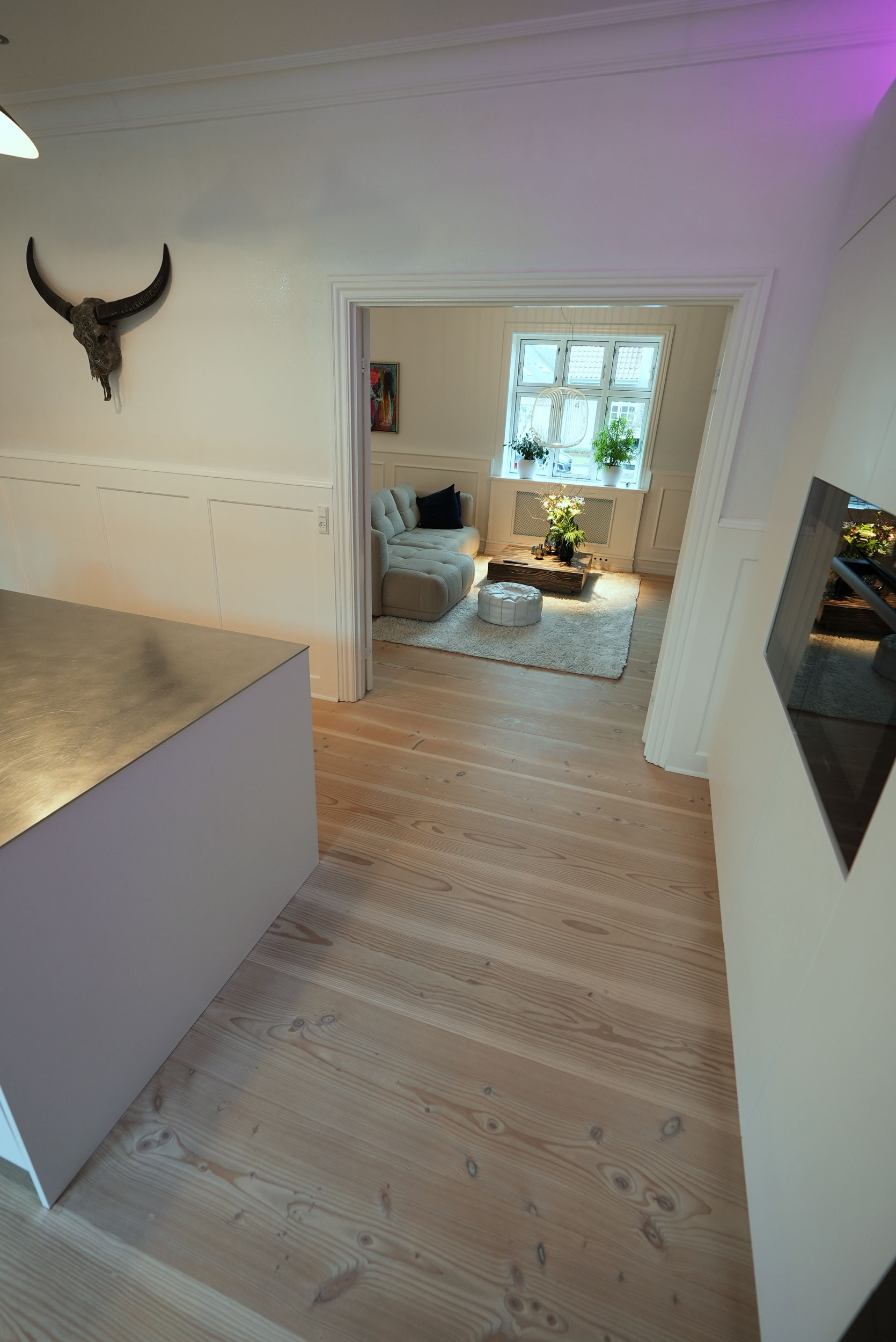 Til dette fine hjem i Esbjerg har vi i dansk plank haft fornøjelsen af at lægge et smukt douglas-gulv med brede planker i længder af op til 10 meter. Gulvet løber ubrudt fra entréen gennem det moderniserede køkken og videre ind i den hyggelige stue for til sidst at ende i spisestuen. Når man som denne kunde vælger de samme gulve fra væg til væg i alle rum, skaber det ro og en helhedsfornemmelse, som ubesværet binder rummene og de forskellige opholdsområder sammen.