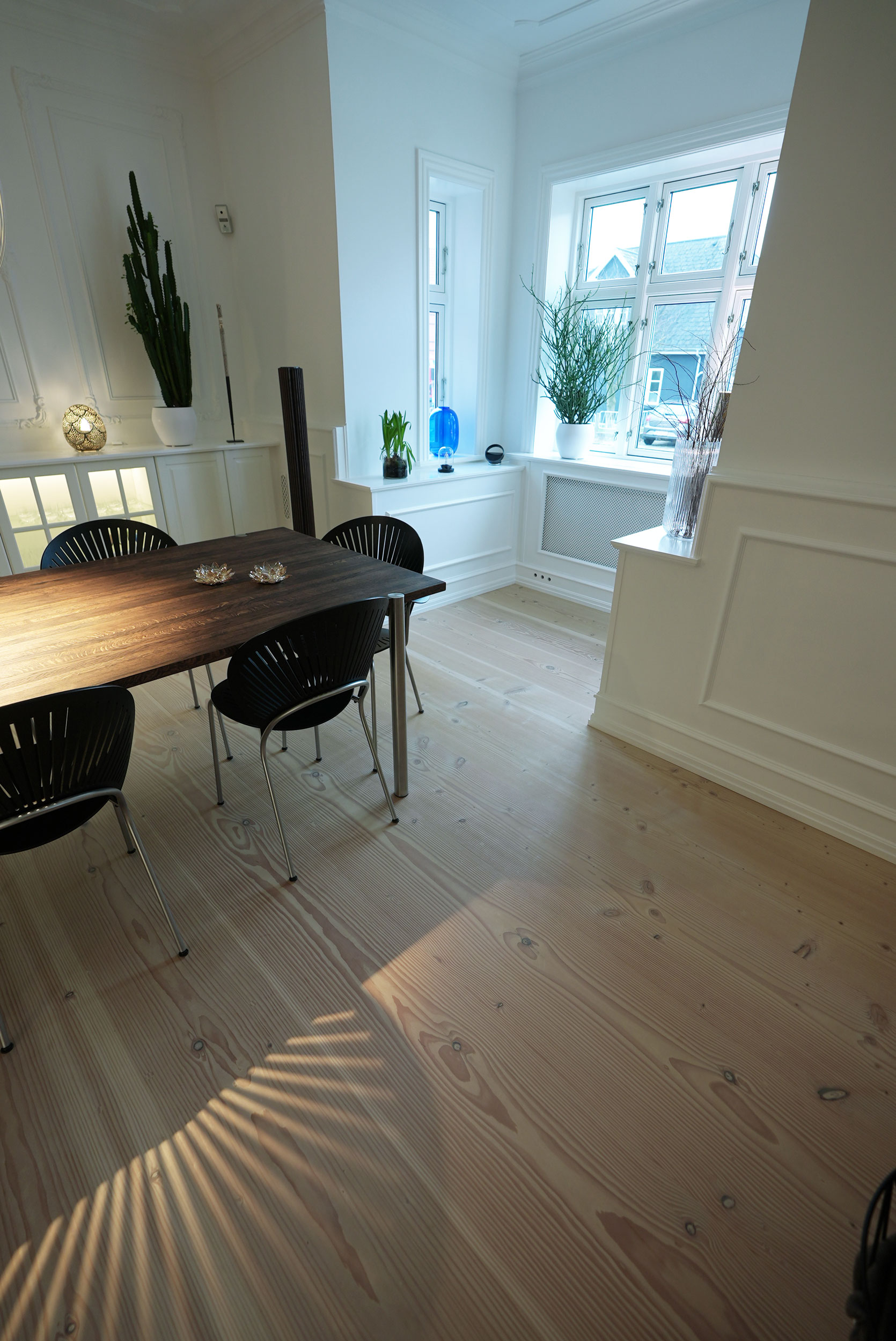 Sæbebehandlingen giver et blødt hvidt skær til træet, som reflekterer lyset fra vinduerne. De massive trægulve er et flot lærred for den moderne indretning i dette elegante og funktionelle hjem.