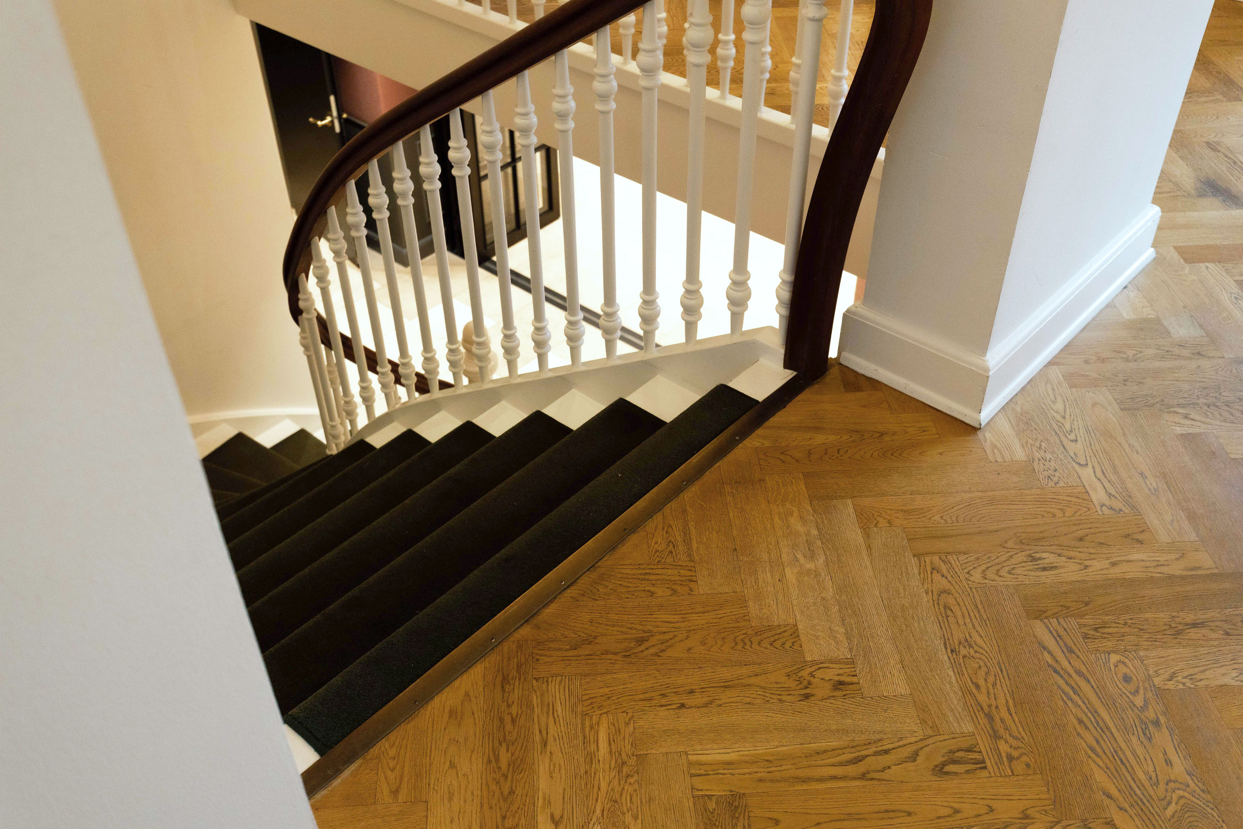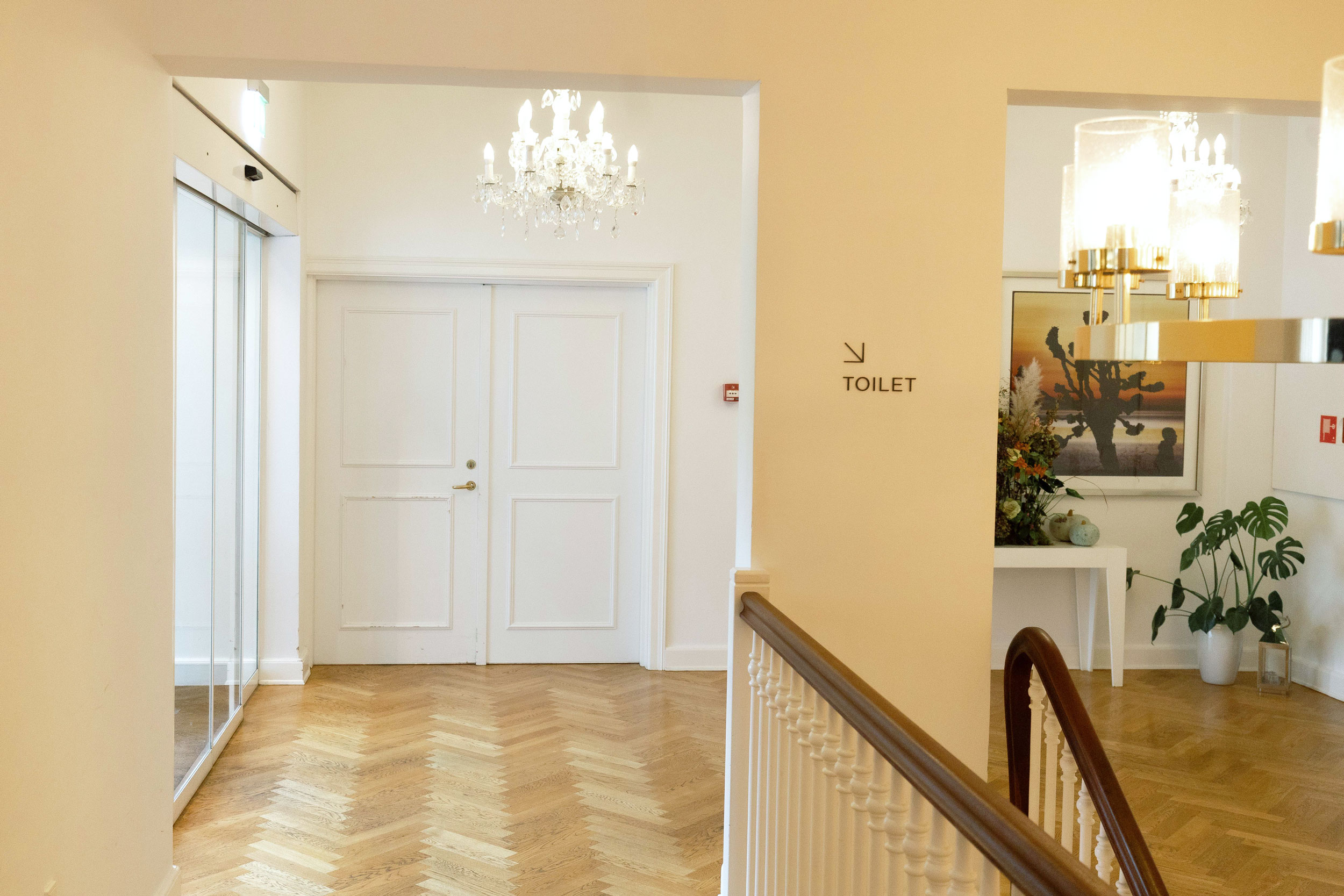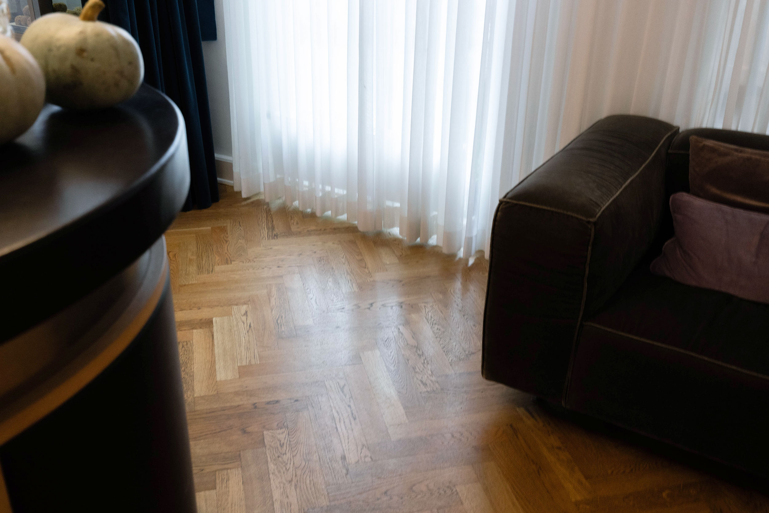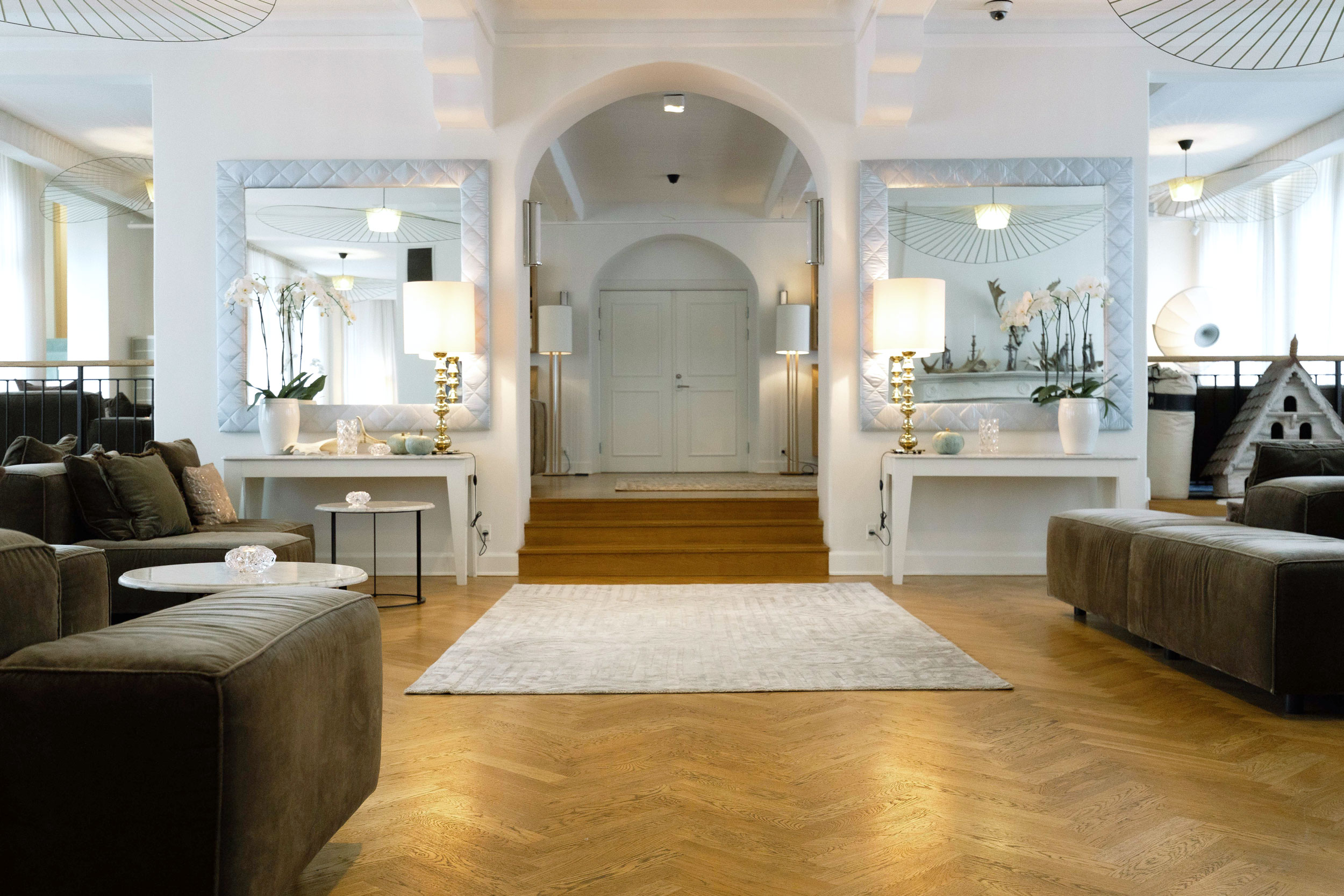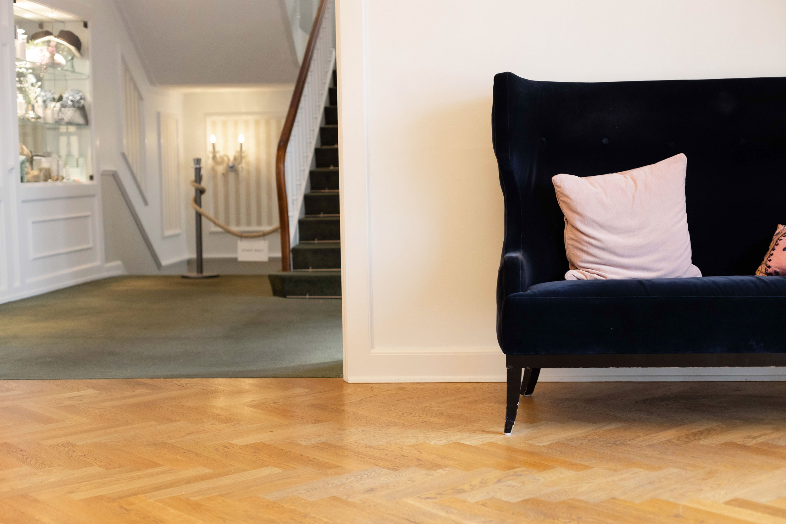 Dansk plank har haft æren af at lægge et smukt sildebensgulv i receptions- og loungeområdet på Kurhotel Skodsborg. Det er et egetræsgulv behandlet med naturolie, der lader træets egen naturlige varme glød komme igennem. I de højloftede rum binder det klassiske sildebensgulv indretningen med hvide vægge, lyse detaljer og mørke loungemøbler elegant sammen. Helhedsindtrykket er nærmest stateligt men samtidigt roligt og indbydende, så man har lyst til at sætte sig i loungeområdet.