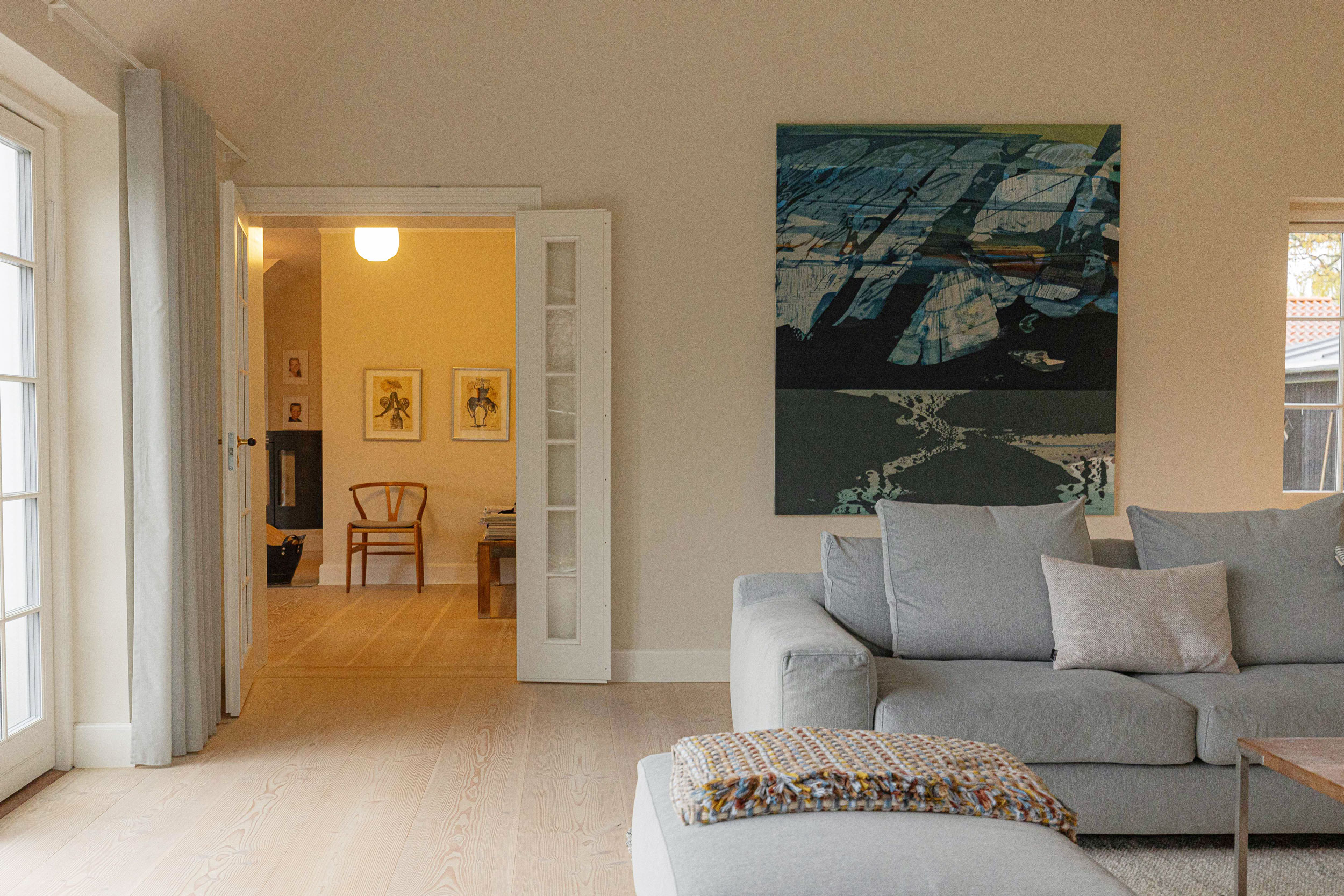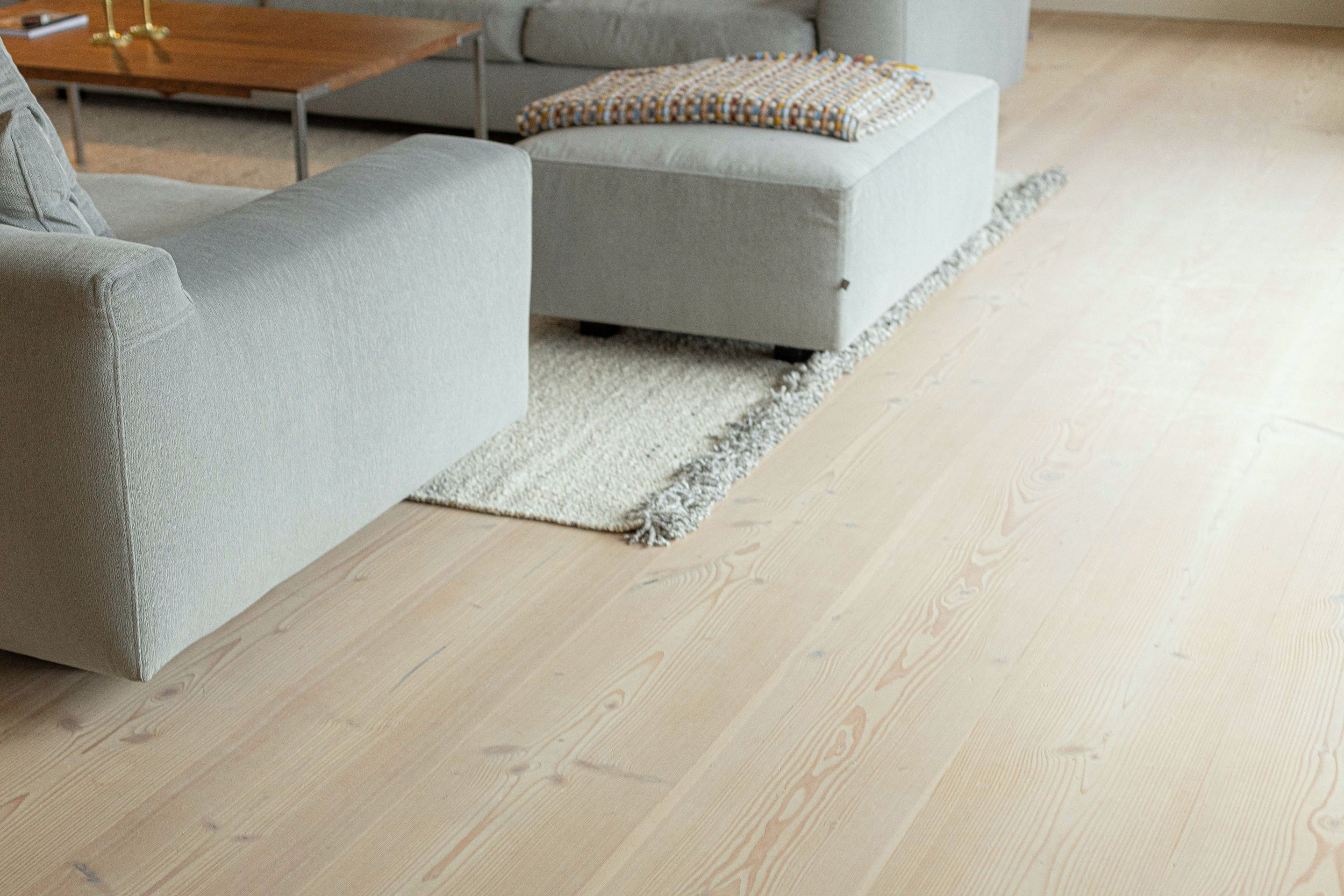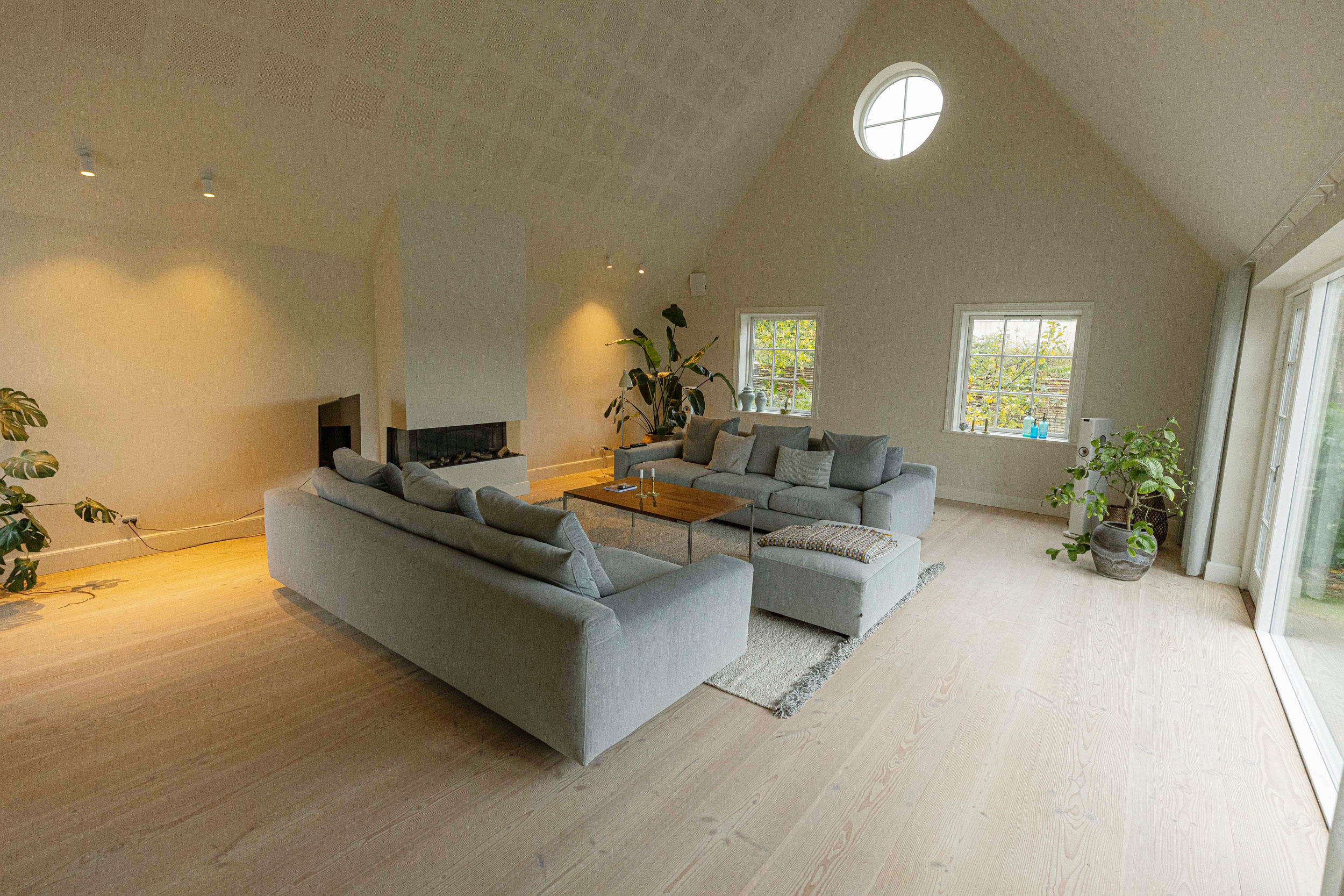 Ejerne af dette hjem nord for København ønskede sig douglas-gulve i fulde længder fra væg til væg, som vi i dansk plank har leveret og monteret. Douglas-plankerne er behandlet med hvid sæbe, som giver et blødt hvidt skær til træet, mens du stadig kan se åretegningerne. I det højloftede rum er det smukke trægulv med til at reflektere lyset fra vinduespartierne, og de lange planker giver et roligt helhedsindtryk.
