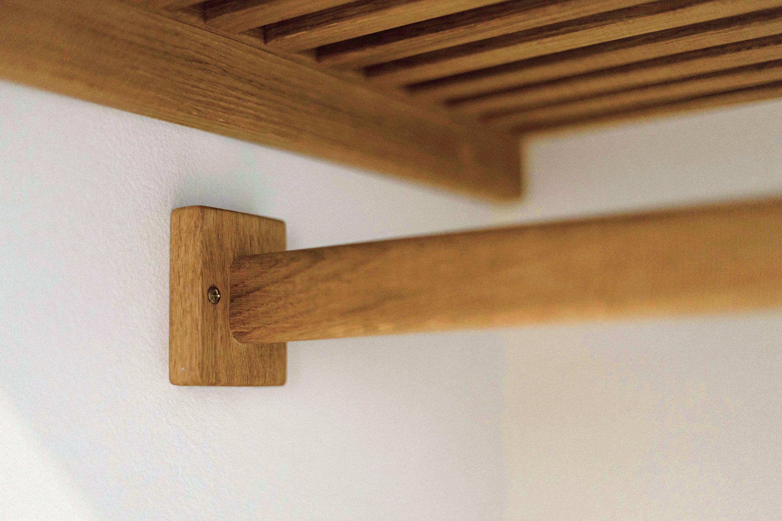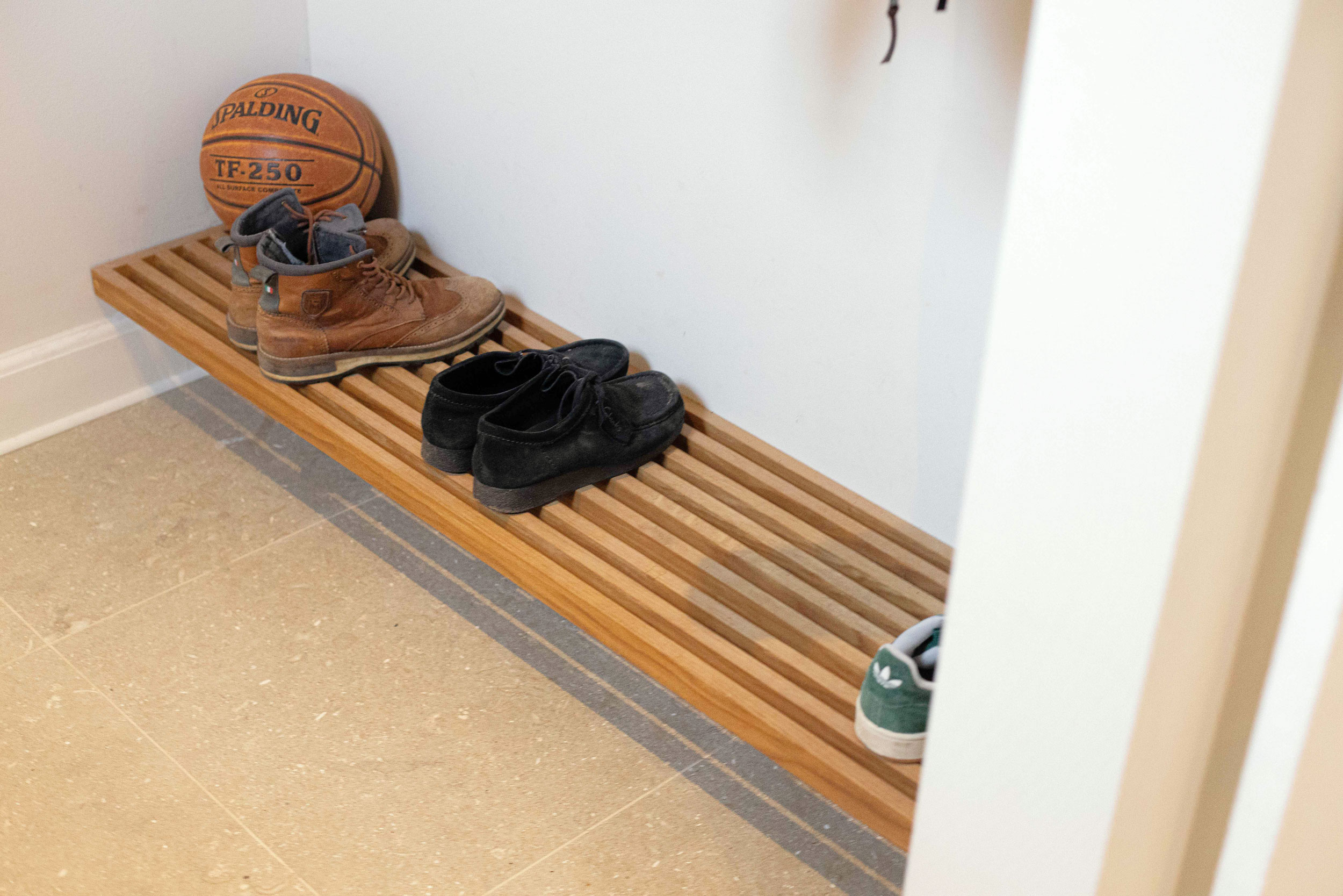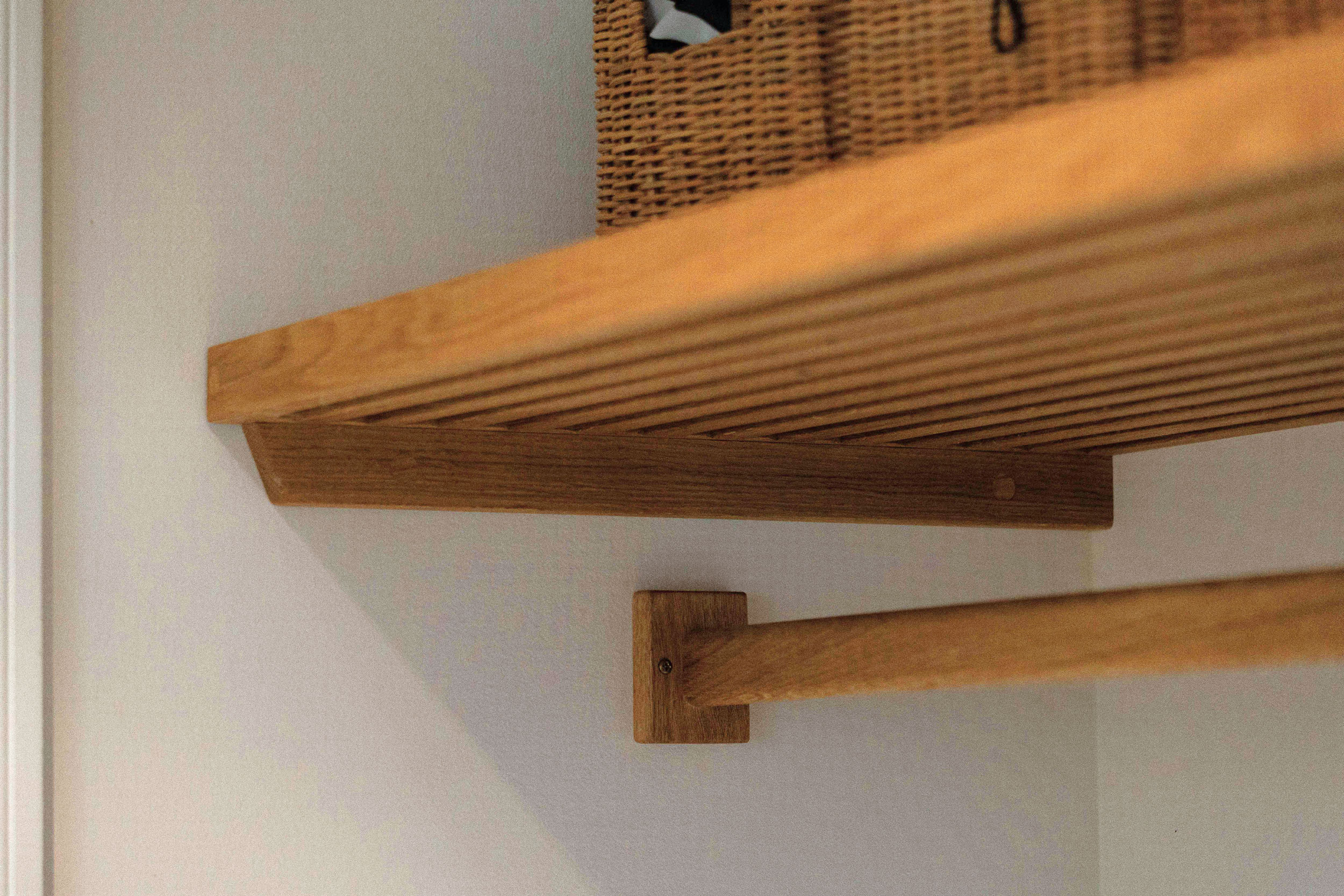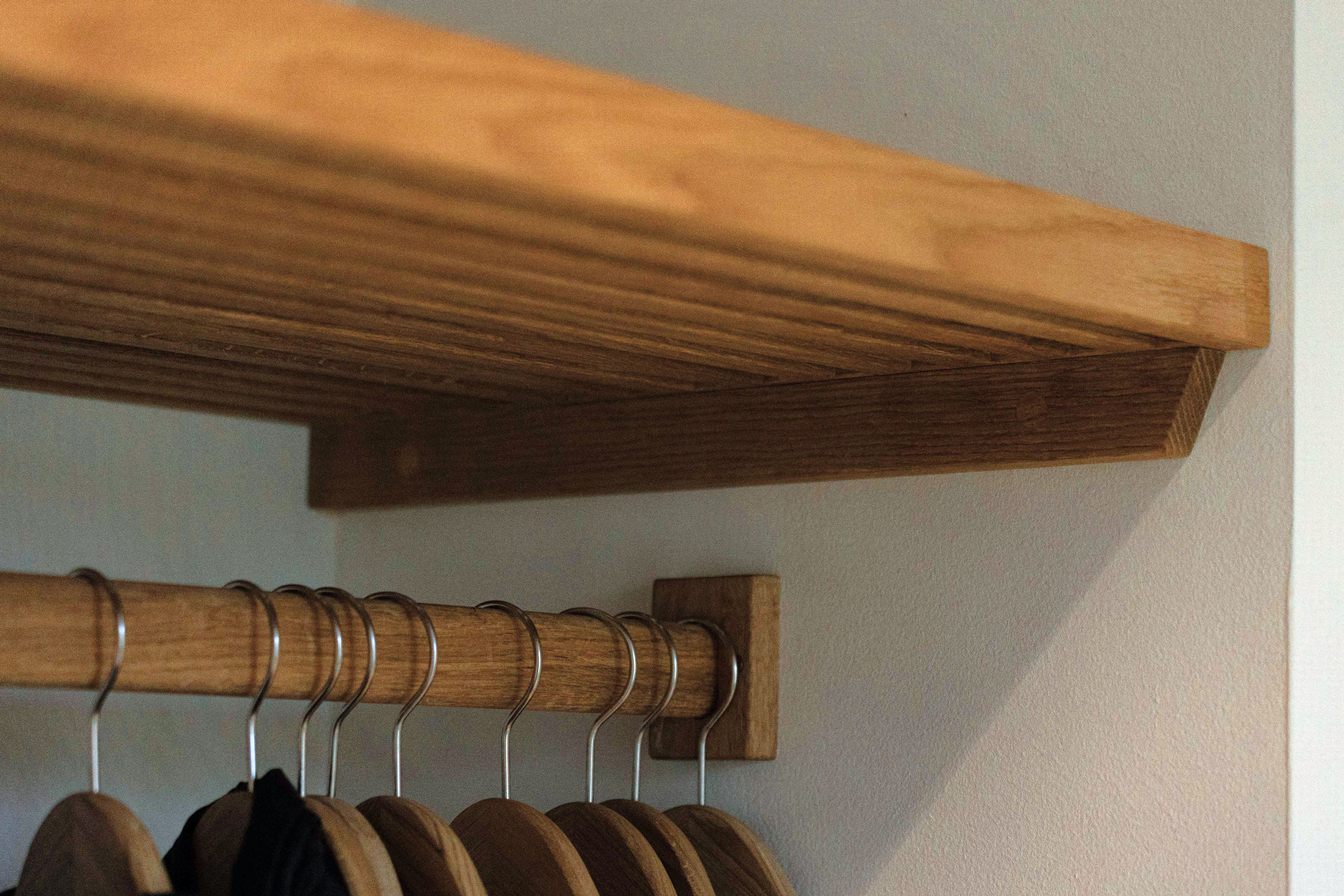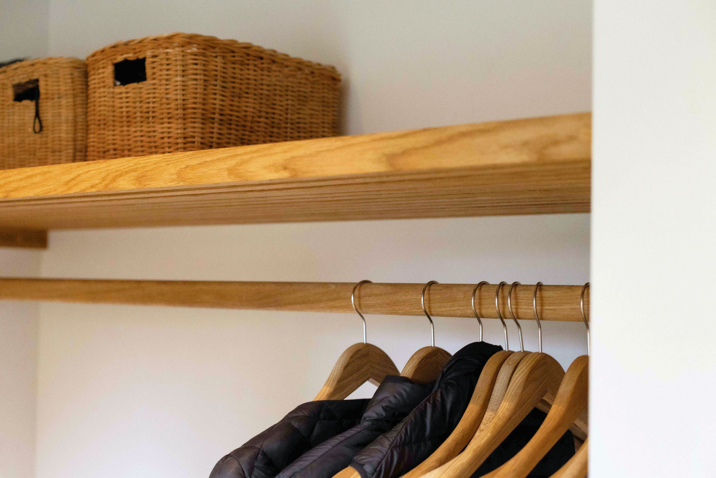 Husets ejere ønskede sig også en specialløsning til garderoben i entréen i deres nyrenoverede hus. Vi snedkererede derfor, i samråd med kunden, en lækker og praktisk løsning til overtøj, sko og alt det andet, der skal have en plads, når man kommer ind ad døren. Garderobeløsningen er lavet i massivt egetræ.